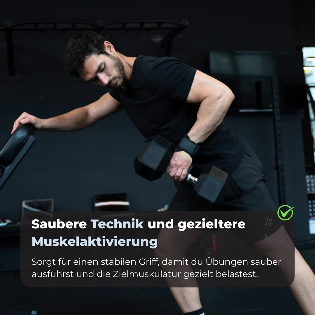 Sie stabilisieren den Griff, reduzieren die Belastung und verbessern die Kontrolle, sodass du schwerere Gewichte mit sauberer Technik und voller Muskelaktivierung bewegen kannst.