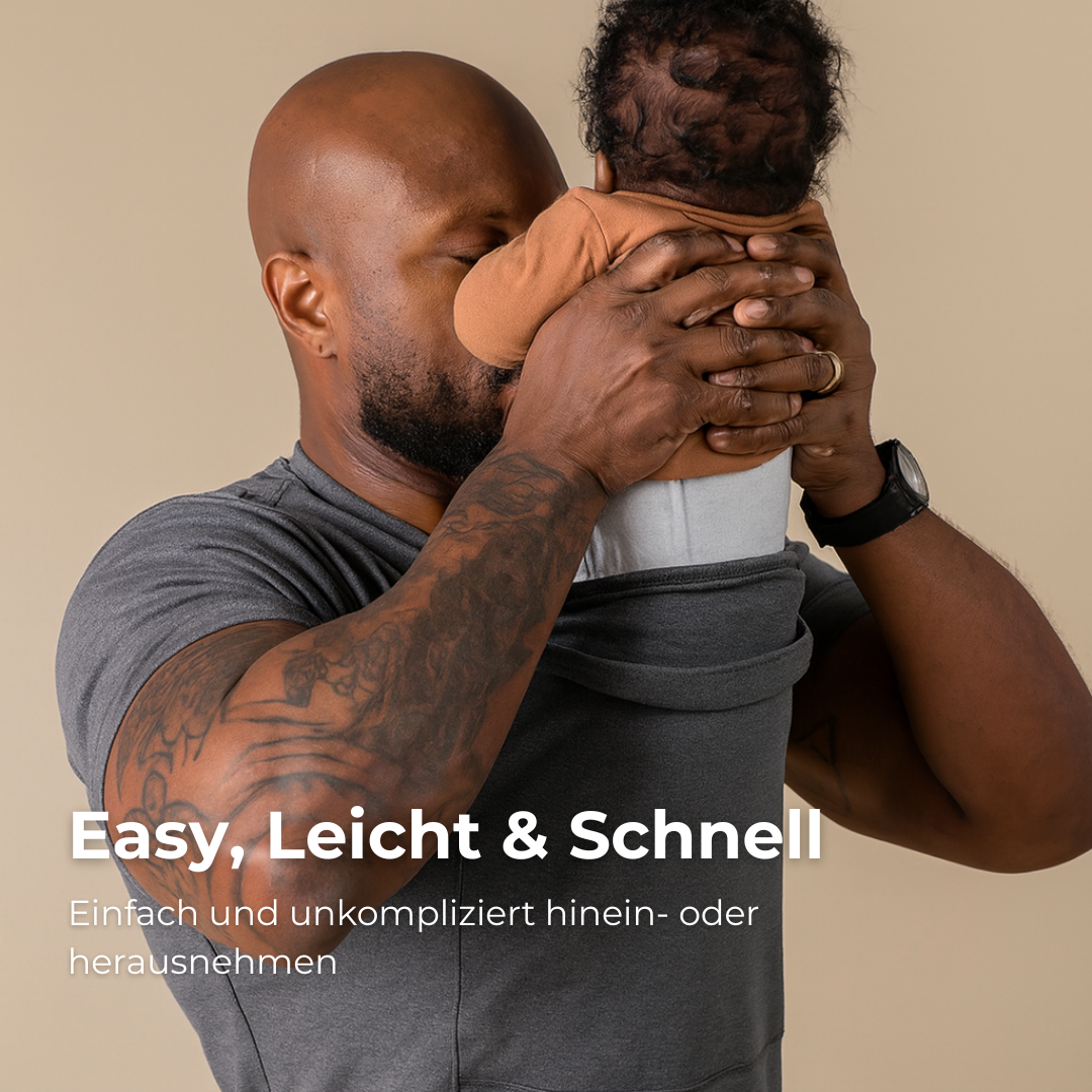 Durch den körpernahen Schnitt liegt das Baby ruhig und stabil an der Brust des Vaters. Es spürt weiterhin Wärme, Bewegung und den vertrauten Herzschlag. Das kann helfen, das Nervensystem zu beruhigen und dem Baby Sicherheit zu vermitteln.