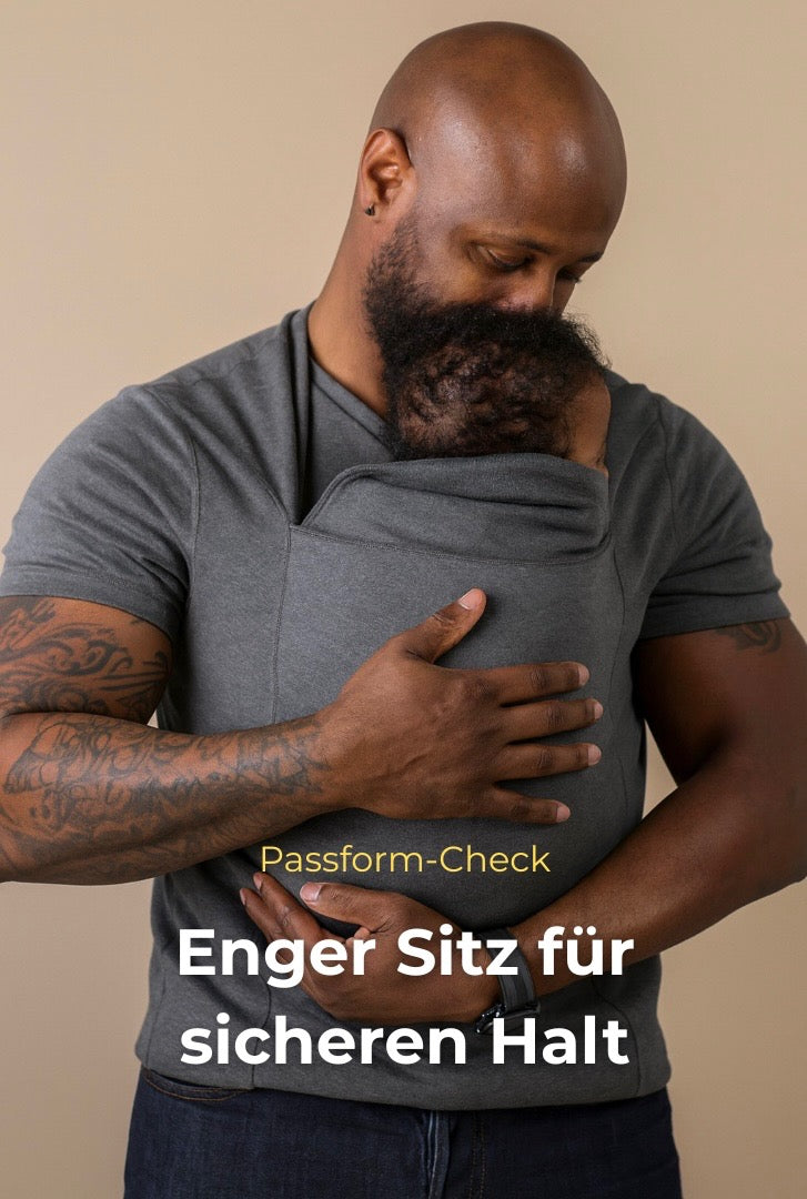 Das HOLDEN sollte eng am Körper anliegen – vergleichbar mit einem Performance- oder Funktionsshirt, nicht wie ein locker geschnittenes T-Shirt. Der körpernahe Sitz ist notwendig, um dein Baby sicher zu stützen und die Tragfunktion korrekt zu gewährleisten. Ein zu lockerer Sitz bietet nicht den erforderlichen Halt für sicheres Babytragen.