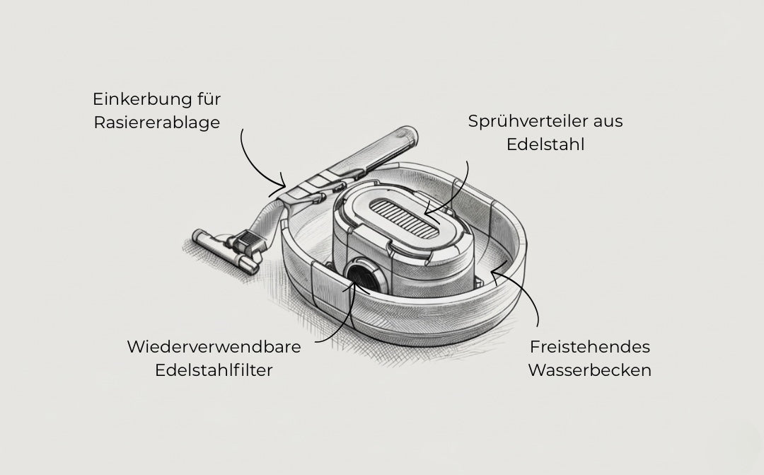 Dank des integrierten Filtersystems wird das Wasser sogar gefiltert und wiederverwendet – für maximale Sauberkeit bei minimalem Verbrauch.