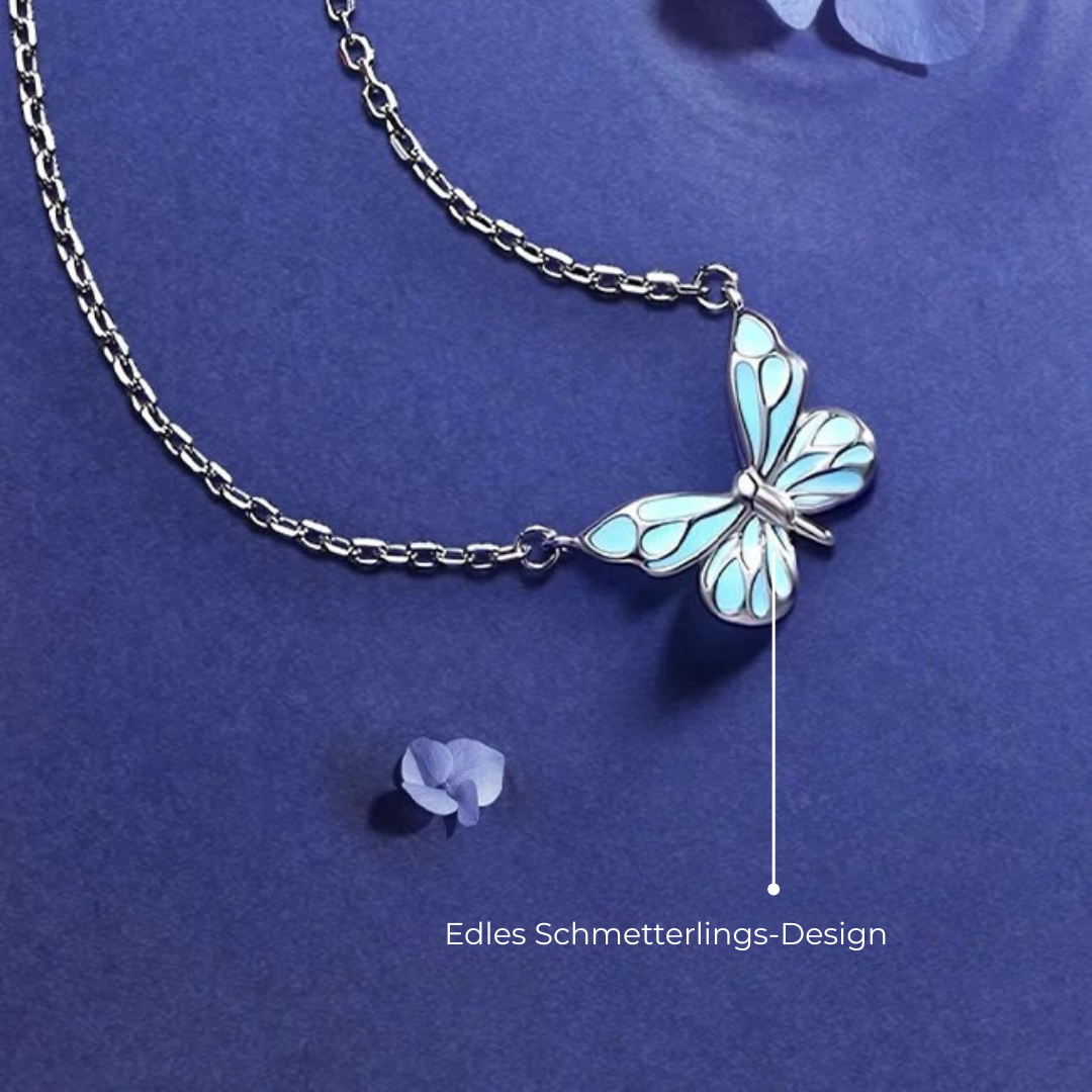 Der fein gearbeitete Schmetterling schwebt auf einer zarten, eleganten Silberkette und entfaltet im Licht einen sanft blauen Schimmer. Doch seine wahre Magie zeigt sich im Dunkeln: Der Schmetterling beginnt sanft zu leuchten und lässt die Kette wirken, als würde sie ein eigenes Licht tragen. Ein Moment, der überrascht. Und bleibt.